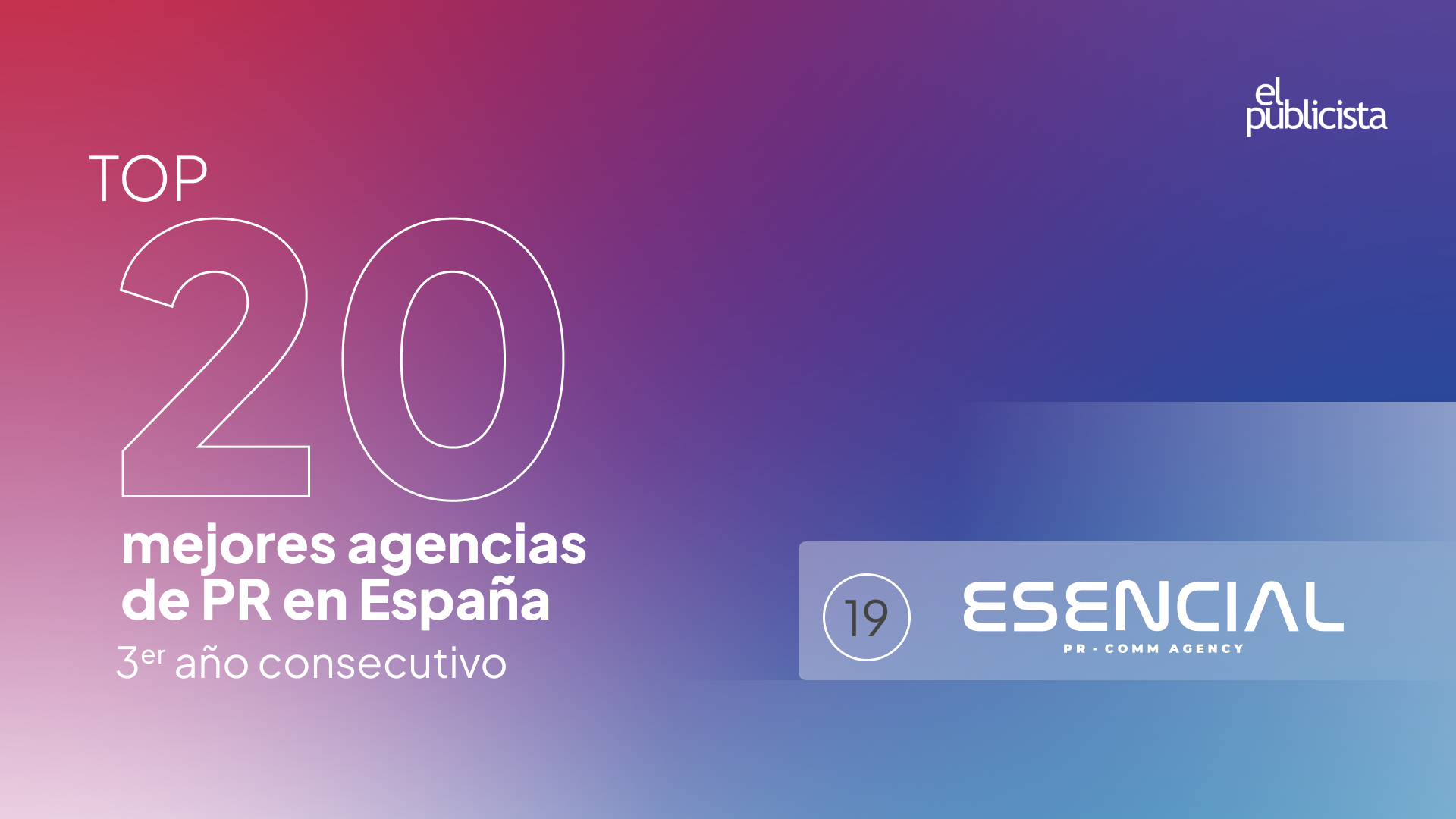 Un año más, la comunicación estratégica confirma su papel como una palanca clave para el crecimiento, la reputación y el negocio de las marcas en España. Y para nosotros, este contexto solo puede vivirse con orgullo: ESENCIAL COMUNICACIÓN vuelve a situarse en el Top 20 del ranking de las mejores agencias de comunicación del país, ocupando de nuevo el puesto 19 en el prestigioso TOP 100 CONSULTORAS Y AGENCIAS DE COMUNICACIÓN EN ESPAÑA 2025, elaborado por El Publicista.
